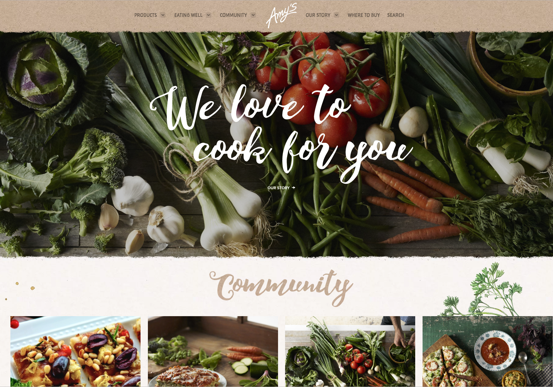 In 2016, I took a job as the in-house creative director at Amy's Kitchen. I was tasked with evolving and modernizing the brand without losing its well-earned place in customers’ hearts. The center of gravity for this effort was focused on reimagining Amy’s website. This not only included the visual tone and design, but also finding a new written voice for the company and its story. I brought in a writer and a London UX company to focus the brand around its unique assets and bring those qualities to the forefront. We then evolved the marketing materials, including sales sheets, presentation templates, product catalogs, newsletters, websites for other countries, and advertising.